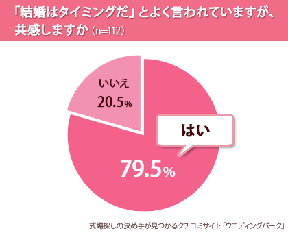 『「結婚はタイミングだ」とよく言われていますが、共感しますか(単一選択)』と質問したところ、79.5%の女性が「はい」と回答し、「10年付き合って別れる人もいれば、交際3カ月で入籍もあり」等、交際期間や恋愛感情よりもタイミングが重要だと考えている事がわかりました。