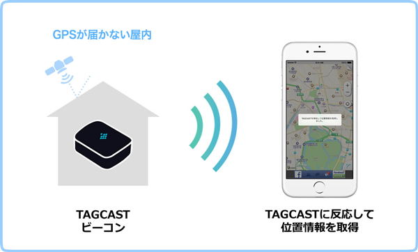 TAGCASTは、TAGCASTビーコン(Beacon)によりBluetoothでスマートフォンにデータを送り、特定のアプリでTAGCASTクラウドと連携して位置情報などのデータを受け取り、アプリを制御するものです。