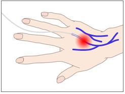 ハンドべインの治療は、最新のレーザー機器を使い、血管内に針を入れてレーザーを照射し、血管を細く収縮させます。他の病気の治療では、レーザーにより血管を完全に閉鎖することもありますが、ハンドべインの場合は病的な血管ではないので閉鎖はできません。