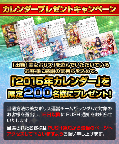 ・内 容: 『出動!美女ポリス』Android/iOSに登録されているお客様の中から、抽選で総勢200名様に2015年オリジナル卓上カレンダーをプレゼント。カレンダーはナビキャラクター達をメインに、ゲーム内で人気獲得数の多い美麗キャラを用いたオリジナル仕様です。