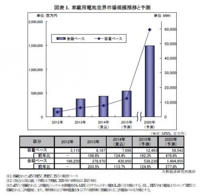 ◆ 2014年の車載用電池世界市場は4,309億5,000万円、容量では7,698MWhを見込む