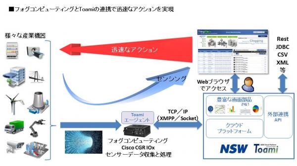 NSWの「Toami」は、M2Mサービスを開発・構築するための専用プラットフォームです。デバイス管理やデータ管理、外部連携機能などを網羅したノンプログラミング開発基盤により、開発効率の大幅な向上とコスト削減を実現しています。また、シスコのフォグコンピューティングは、クラウドとデバイスの間に位置し、データ発生場所の近くで、事象に基づく判断を迅速に行え、ネットワーク負荷軽減も実現できます。
