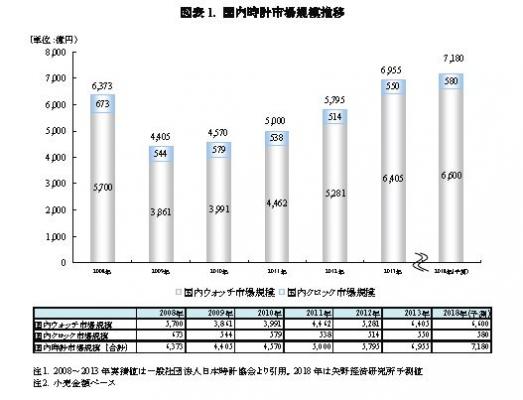本調査における国内時計市場とは、「ウォッチ(腕時計)」、「クロック(置時計・掛時計・目覚まし時計)」の2分野を指し、2008年~2013年の実績値は一般社団法人日本時計協会の資料から引用している。