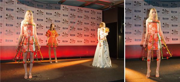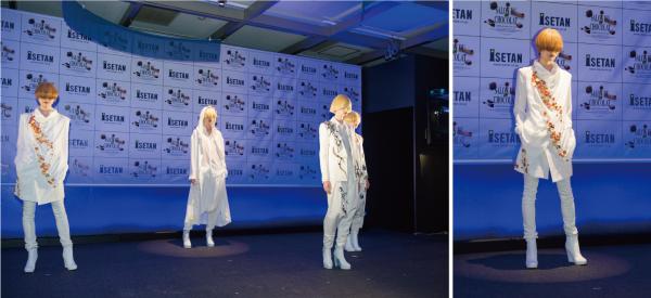 また「ELEGANT」のテーマを担当した学生13名とレコールバンタン パティシエの鍋田幸宏シェフ、バンタンデザイン研究所卒業生でブランド「Yavuu(ヤウオ)」のデザイナー B.ヤウオツァガンが、神社、仏閣など伝統的な建築や工芸品が持つ繊細で優美な美しさをイメージした“ショコラドレス”3体を披露。