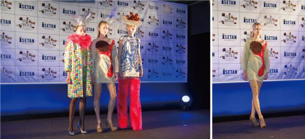 -ファッションショーの様子 「ELEGANT」(左3体)、「POP FANTASY」(中央3体)、「MODE」(右4体)をテーマにしたショコラドレス-(上・画像)