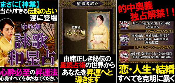 本占い「詠歌和星占」では、あなたが生まれ持った和星を読み、その星にそぐった歌を詠み合わせていくことにより、今、あなたの人生がどんな状況にあるのか、そして今後どのような局面を迎える定めにあるのか、始点から終点までを分かりやすく明らかにし、ゆり迦が幸福へとお導きします。