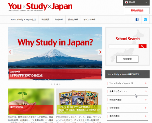 You×Study×Japanでは、日本での留学を検討している学生やその保護者の方および、すでに日本国内で学んでいる留学生向けに、日本留学の方法や日本文化、生活支援、日本国内の日本語学校・大学・大学院・専門学校の学校情報及び進学、就職までの情報を提供します。留学生を募集したい教育機関は、自校のマーケティングやPRに活用できます。