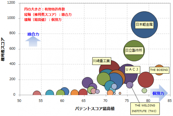 摩擦撹拌接合とは、先端に突起のある工具を回転させながら押しつけ、摩擦熱によって軟化した材料を塑性流動させることにより接合する技術で、鉄道、自動車等、幅広い分野で利用されています。本技術はイギリスのThe Welding Institute(TWI)が開発し、基本となる特許を世界各国で権利化しており、日本でも2件が権利化されています(うち1件は期間満了により権利失効)。本調査では摩擦撹拌接合技術の特許を集計し、各個別特許の注目度を得点化する「パテントスコア」をベースとして、特許の質と量から総合的に見た評価を行いました。