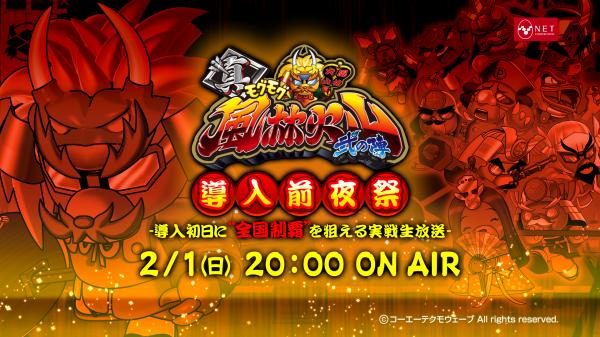 遊技機メーカー・ネット株式会社(本社:大阪市 代表取締役:国本幸司)は、2月2日より全国に導入予定のパチスロ新機種「真モグモグ風林火山2」の導入前夜祭として、「導入初日に全国制覇を狙える実戦生放送 -」をニコニコ生放送の当社公式チャンネル「NET SLOT LIVE!!」から生中継します。放送開始は、2015年2月1日(日)20時を予定しております。