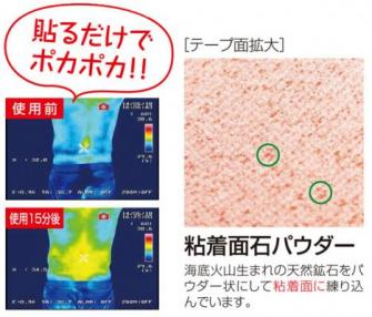 今回発売いたします『温光岩盤テープ』は、そうしたノウハウを活かし、高い蓄熱性・遠赤外線放射性を持つ厳選の天然鉱石パウダーをテープの粘着面に練り込むことで “あたためる” 要素を加えた、言わば岩盤浴みたいなテーピングです。