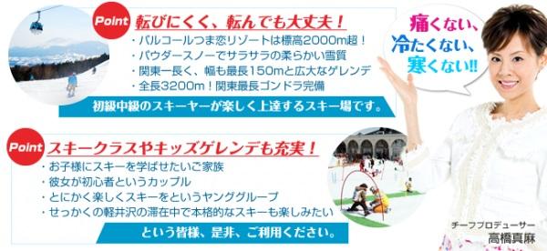 ブリーズベイホテル株式会社が運営する「パルコール嬬恋スキーリゾート」では スキー初心者の女性にむけてお得な「レディースプラン」を2015年1月27日より平日毎日実施します。お車をお持ちでない女性どうしの女子旅に、お子様と一緒にゲレンデデビューしたいお母様に、スキー初心者の彼女とのデートに。様々なシーンでご活用いただけるお得なプランです。
