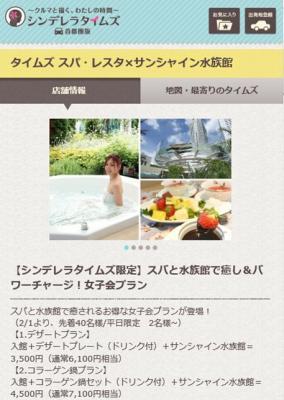 この度2015年2月より、シンデレラタイムズ限定『スパと水族館で癒し&パワーチャージ!女子会プラン』の提供をスタートします。平日のゆったりとした空間の中で、女性同士でリラックスして楽しく過ごすことのできる内容を組み合わせました。スパ利用と、レストランで楽しむデザートまたはコラーゲン鍋、さらにスパから徒歩1分の場所あるサンシャイン水族館の入場券がセットになっています。