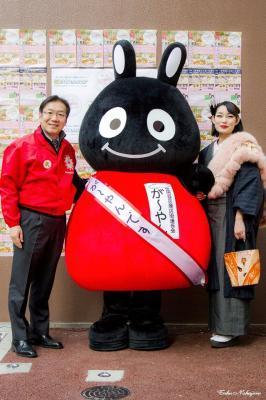 (写真左)三軒茶屋銀座商店街振興組合 飯島祥夫理事長、「がーやん」、モデルの甲斐琴珠
