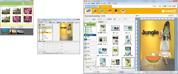 デジタルカメラの写真を選ぶだけで簡単にレイアウトされる [かんたん写真はがき機能] や簡単にかわいらしい装飾が行える [キラキラデコレーション機能]、[コラージュ機能] 、写真を明るく補正する機能と併せ、よりオリジナリティーあふれるポストカードの作成をサポートします。