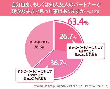 一方で『自分自身、もしくは知人友人のパートナーで残念な夫だと思った事はありますか(単一選択)』という質問では「自分のパートナーに対して、残念だと思った事がある(26.7%)」、「知人友人のパートナーに対して、残念だと思った事がある(36.7%)」と63.4%の女性が自分もしくは知人友人のパートナーを残念だと思った事があることがわかりました。