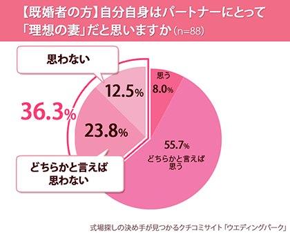 既婚女性を対象に『自分自身はパートナーにとって「理想の妻」だと思いますか(単一選択)』という質問をしたところ、「思う(8.0%)」「どちらかと言えば思う(55.7%)」と約6割の女性が「自分は理想の妻」という認識がある一方で、「どちらかと言えば思わない(23.8%)」「思わない(12.5%)」と、約4割の女性が「自分は理想的な妻ではない」と思っている事がわかりました。