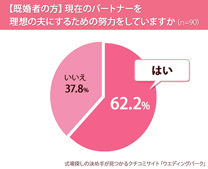 既婚女性を対象に『現在のパートナーを理想の夫にするための努力をしていますか(単一選択)』という質問をしたところ、62.2%が「はい」と回答。「大げさに褒める」、「具体的に指示をする」、「日頃から会話を大切にする」など、様々な工夫をしていることがわかりました。