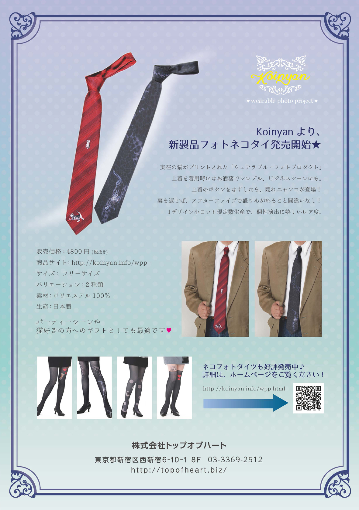 ペットの犬猫の写真撮影及びストックフォトサービスを提供する株式会社トップオブハート(所在地:東京都新宿区、代表取締役:村田三二)は、2014年に発売された「猫フォトタイツ」に続き、2015年2月より大人可愛い猫写真デザインの「KOINYAN(こいにゃん)フォトネコタイ」の販売を開始しました。