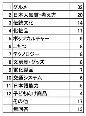 ・かわいい文化(アメリカ人)、ゆるキャラ(カナダ人)、アニメ関連商品、プリクラ(アメリカ人)など