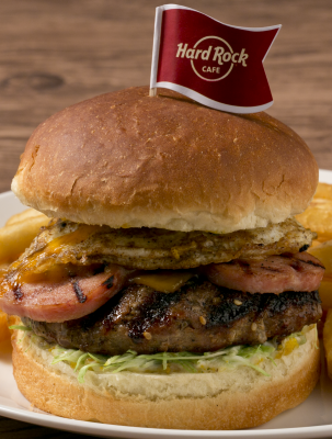 アメリカンレストラン「ハードロックカフェ」は、2月16日(月)から全国各地で公演されるミュージカル「モンティ・パイソンのSPAMALOT featuring SPAM(R)」とのタイアップメニュー「レジェンダリースパム(R)&エッグバーガー」(2,080円 税サ別)を、国内6店舗にて2月1日(日)から3月15日(日)までの期間限定で販売します。イギリス・ロンドン発祥のハードロックカフェと、イギリスを代表するコメディ・グループ “モンティ・パイソン”のミュージカルとのコラボレーション。そのメニューの内容は、ミュージカルのタイトルSPAMALOT(スパムがたくさん)にかけ、スパムをビーフパテ、フライドエッグなどと一緒にバンズではさんだスペシャルバーガーです。是非、この機会にお楽しみください。