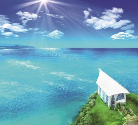 「クリスタルチャペル」は、タモン湾の大迫力のパノラマビューを望む大聖堂をイメージしました。目の前にはグアム有数の美しい珊瑚礁が続くエメラルドグリーンの海が広がります。「ウエディング・ヴィレッジ」内には「クリスタルチャペル」のウエディングチャペルを中心に、ウエディングサロン、パーティ会場、写真館が設備され、ひとつの街のような作りでオンリーワンのウエディングセレモニーを展開することが出来る特別な空間です。