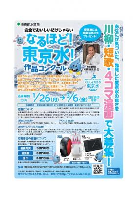安全でおいしいだけではなく、環境や家計にもやさしく、生活にかかせない・・・。 そんな「くらしを支える東京水」の良さを、皆様に知っていただくため、 東京都水道局では作品コンクール(川柳・短歌・4コマ漫画の3部門)を開催します。 水道水にまつわるエピソードや、水道水について思うこと等を表現した 素敵な作品を是非ご応募ください! 特別審査員に片岡 鶴太郎氏を迎え、各部門の専門家による審査を行います。