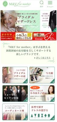 2014年8月にオープンした新郎新婦の母親向けドレスレンタルサービスブランド「M&V for mother」のHPでは、母親として結婚式に列席するお母様向けの情報を提供しており、順調にアクセスを伸ばしておりますが、昨今のモバイル端末ユーザーの増加に伴い、更なるユーザービリティー向上を目的として、この度スマートフォン対応サイトをオープンいたしました。スマートフォン対応により、さらに商品が見やすくなり、スマートフォン画面からの電話予約も可能となりました。