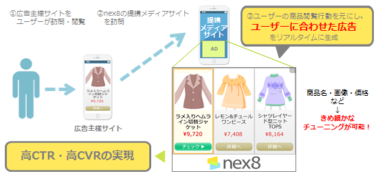 また、独自に開発したシステムにより、ユーザーが商品一覧ページを閲覧して離脱したのか、詳細ページまで閲覧したが申込・購入に至らなかったのかなど、ユーザー行動の段階に応じて配信内容を細かくチューニングできることが、「nex8ダイナミックリターゲティング」の特長です。