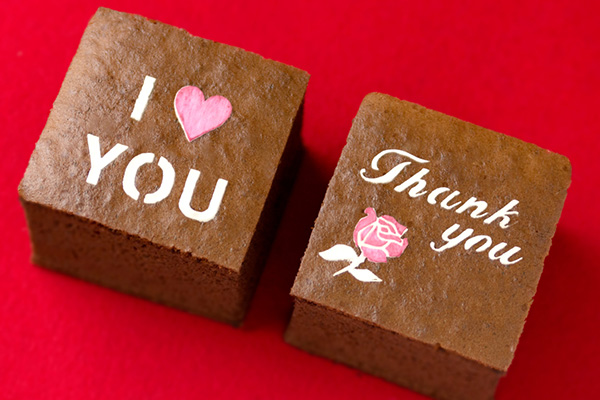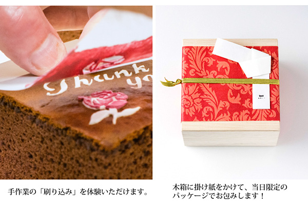 バレンタインにあわせて販売される冬季限定のチョコレートカステラ「恋雅」は、濃厚なチョコレートカステラの天面に椿の文様が刷り込まれています。2015年1月27日にNaverのまとめでも複数紹介されるなど、カステラを看板商品とする然花抄院においても、冬の人気商品の一つです。その「恋雅」の絵柄を、おてづくり教室にあわせて新たに「I LOVE YOU」「THANK YOU」の2種類作成、いずれかの絵柄を選び、お客様自身で、カステラの天面に刷り込む作業を体験いただけます。大切な方への贈り物、お客様の想いがつまった世界に一つだけのカステラをおつくりいただけます。