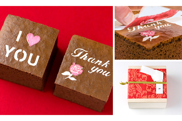 バレンタインにあわせて販売される冬季限定のチョコレートカステラ「恋雅」は、濃厚なチョコレートカステラの天面に椿の文様が刷り込まれています。2015年1月27日にNaverのまとめでも複数紹介されるなど、カステラを看板商品とする然花抄院においても、冬の人気商品の一つです。その「恋雅」の絵柄を、おてづくり教室にあわせて新たに「I LOVE YOU」「THANK YOU」の2種類作成、いずれかの絵柄を選び、お客様自身で、カステラの天面に刷り込む作業を体験いただけます。大切な方への贈り物、お客様の想いがつまった世界に一つだけのカステラをおつくりいただけます。