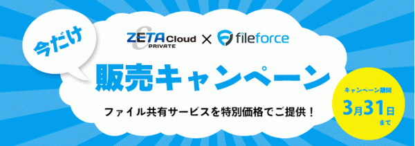 エヌシーアイは、ファイルフォース株式会社(本社:東京都新宿区、代表取締役:関根 文彦、サルキシャン アラム、以下、ファイルフォース)と共同で、エヌシーアイが提供するエンタープライズ向けプライベートクラウドサービス「ZETA Cloud Private」上からファイルフォース社が提供するファイル共有サービス「Fileforce」を搭載しサービスを提供しています。今回「ZETA Cloud Private」×「Fileforce」を手軽にご利用いただくために、2月から3月31日までにお申し込みいただいたお客様に提供する期間限定の特別価格による販売キャンペーンを実施します。部門やグループでまずは利用してみたいというお客さまにはライトプランを、全社でのご利用をご検討されているお客さまにはエンタープライズプランをご用意いたしました。