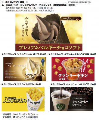ギフトサービス「giftee」を運営する株式会社ギフティ(本社:東京都品川区 代表取締役:太田睦)は、2015年2月4日(水)より、同サービス内にて、ミニストップ株式会社(本部:千葉県千葉市 代表取締役社長:宮下直行、以下:ミニストップ)の人気商品であるソフトクリーム バニラや、バレンタインのギフトにぴったりの新商品「プレミアムベルギーチョコソフト」など、全5アイテムの取り扱いを開始します。