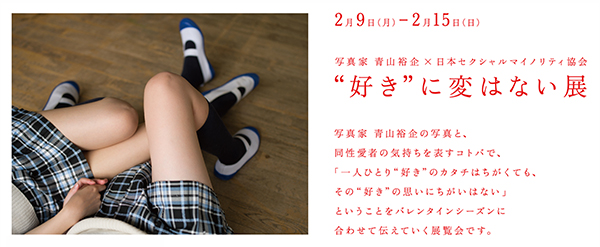 バレンタインシーズンに合わせて、写真家 青山裕企の写真と、同性愛者の気持ちを表すコトバによる展覧会を開催します。さまざまな“好き”のカタチを世の中に発信していくことで、同性愛者への理解を促し「一人ひとりみんなちがう」ことを認め合うきっかけになればと思います。