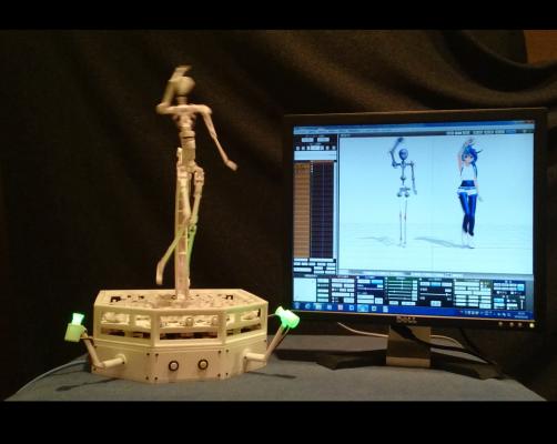 今回、その技術をより進化させたMF303は、28自由度の駆動機構を持ち人間に近い繊細な動作が可能であり、さらにIT業界デファクトのRaspberryPi基板を実装してLINUXでのソフト開発が可能、また人気の高い3DCG制作ソフト:MikuMikuDanceでモーション作成が可能となっていおり、 今まで実現不可能だったスリムでキュートな女子型の萌え系フィギュアを静かに動かすことが出来るようになり、オタク市場のユーザーに対して新しい企画の商品を提供することが出来るようになった。新しいモーションエンタテインメントの時代を切り開く。