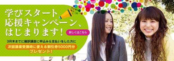 2015年3月31日までに、通信科および通学科の翻訳講座に申込み&支払をされた方に「次回講座受講時に使える割引券5000円分」をプレゼントするもので、