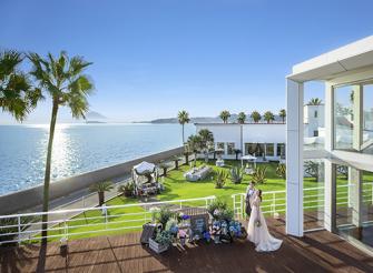 澄み渡る空と青い海を見晴らすガラスのチャペルや、全てオーシャンビューの5つのパーティ会場は圧巻の美しさ。