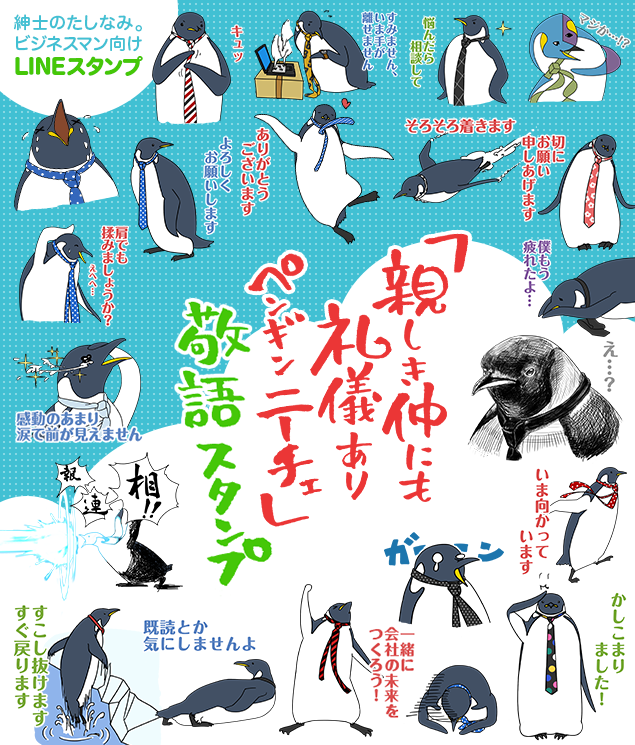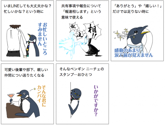 LINEスタンプ「親しき仲にも礼儀あり ペンギン ニーチェ(以下ペンギン ニーチェ)」は、昨今増加する上司や同僚とのLINEトークをよりスムーズに、より楽しくするスタンプです。「ビジネス定型句」と「スタンプ」がスマートに一体化することで ”ユルすぎずカタすぎない” ”カワイすぎずシブすぎない” 絶妙な温度感をプロデュース。上司から部下への妙な気遣い、ジェネレーションギャップからくる上司と部下の微妙な会話、激務で自宅に3日帰っていない同僚との神経を使うやりとり…といった日本のビジネスシーンにあまねく偏在する無駄なコミュニケーションストレスを無くし、多忙を極めるジャパニーズオフィスワーカーにライトな笑顔を広げます。
