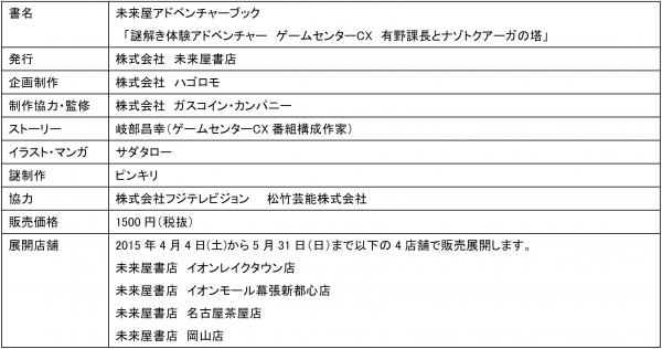 イオングループの株式会社未来屋書店(本社:千葉市、以下 未来屋書店)は、読者が店内の手がかりをもとにストーリーを読み進める参加体験型ブック「未来屋アドベンチャーブック」の新作「謎解き体験アドベンチャー ゲームセンターCX 有野課長とナゾトクアーガの塔」を、CS放送「フジテレビONEスポーツ・バラエティ」で放送中の人気番組「ゲームセンターCX」とのコラボレーションにより制作。2015年4月4日に発売します。