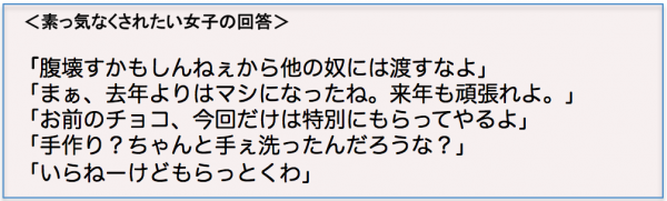 ◇チョコのお返しに言ってもらいたい言葉は「ありがとう」。一部に素っ気なくされたい女子の存在も
