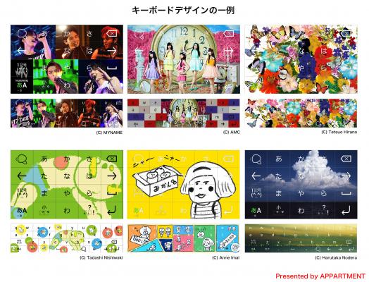 APPARTMENT(アパートメント)が提供している、音楽、アート、ファッションシーンを代表するアーティストのデザインが、今度はSimejiのキーボードデザインとして楽しめます。 Android版でのコラボレーション開始に伴い、ぽこた、MYNAME、東京女子流をはじめとしたさまざまなアーティストのデザインが登場、イラストレーターやアートディレクターなどAPPARTMENTならではのラインナップも特徴です。いずれも、Simejiだけのオリジナルデザインです。