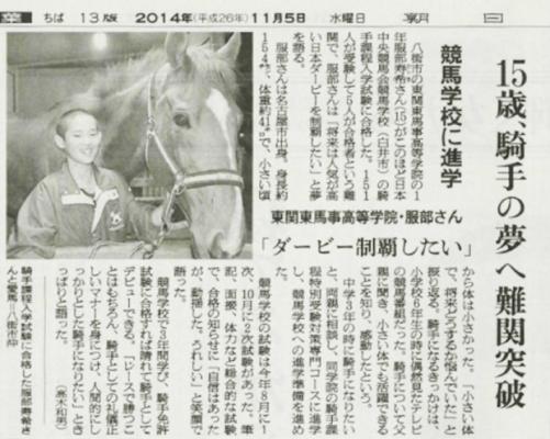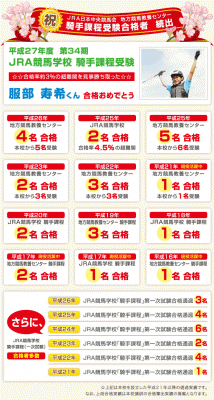 平成27年2月9日、地方競馬教養センターの騎手課程受験合格者の発表があった。千葉県八街市の競馬の騎手養成コースがある高校「東関東馬事高等学院」では、平成27年度の地方競馬の騎手課程受験に挑んだ生徒4名が騎手課程受験を合格。東関東馬事高等学院では、昨年、JRA競馬学校 騎手課程受験を受験した生徒1名も合格を果たし、平成27年度の騎手課程受験合格者は5名。開校以来6年連続(通算22名)が合格している。