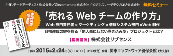 ビジネスサーチテクノロジ株式会社(本社:東京都千代田区、代表取締役社長:川邉雄司)は、データアーティスト株式会社(本社:東京都渋谷区、代表取締役社長:山本覚)、Ginzamarkets株式会社(本社:東京都港区、代表取締役社長:レイ・グリセルフーバー)と共同で、セミナー『売れるWebチームの作り方』を2015年2月24日(火)に開催いたします。