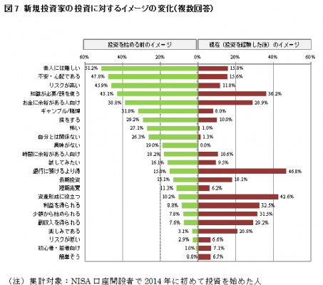推計の元となった状況別の投資意向をみると、2014年に既にNISA口座で投資を開始した人については70.5%、2014年末までに口座を開設しながらも投資しなかった人で、2015年は投資する意向のある人は60.2%、また2015年に口座を開設する人で、実際に投資する意向のある人は82.2%となっています。