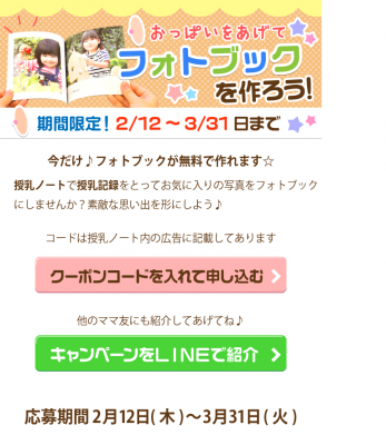 ・応募方法:アプリ「授乳ノート」を無料でダウンロードしていただくと、フォトブック無料チケットがもらえます。