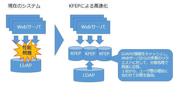 かもめでは、大手通信会社でのモバイル認証で数千万ユーザー規模の事例を含めた多数の実績がある独自の高速分散KVS「KFEP」を活用して、既存のLDAPを高速化するソリューションを提供します。