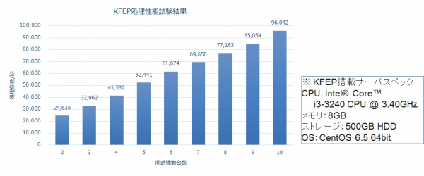 KFEPのサーバ台数を増やすことで、スケーラブルに性能を拡張することが可能です。低スペックなIAサーバでも秒間10万件を処理することができます。