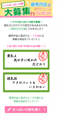 ・応募方法:「授乳ノート」を無料でダウンロードいただき、おっぱい川柳応募コーナーよりご応募下さい。