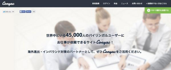 Conyacは世界中のバイリンガルに言語に関連のある業務をアウトソーシングし、海外進出の際に必要となる業務を全般的に依頼することが可能なサービスとなっております。2009年5月にサービスを開始して以来、順調にユーザー数を伸ばしており、現時点のバイリンガルユーザー登録数は、45,000人、利用企業数は1,000社、総依頼数は132,000回にのぼります。