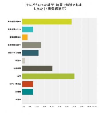 「主にどういった場所・時間で勉強していますか?」という質問では、1位「自宅」(70.4%)、2位「通勤時間(電車)」(66.7%)、3位「会社の休み時間」(22.2%)という結果となりました。また、「通勤時間(電車)」、「通勤時間(バス)」、「通勤時間(車)」を合計しただけでも、90%弱となり、「通勤時間」を活用している人の割合が、1位の「自宅」を大きく上回っています。
