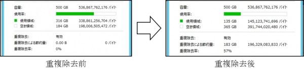 データ重複除去機能により、利用可能なディスク領域を増やすことが可能です。除去率は約50% (Microsoft発表)。